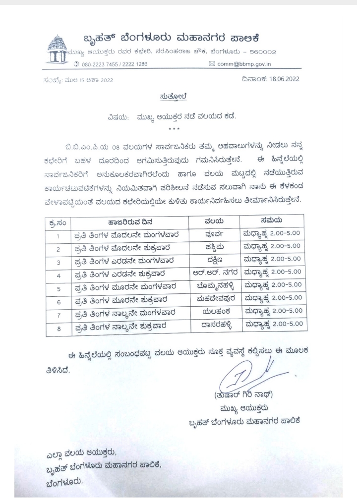 Nath observed that the BBMP area is vast and huge. Several citizens’ frequent BBMP head office to submit their requests, complaints and grievances to get them redressed. In an attempt to prevent people coming from far off places to the BBMP head office Tushar Giri Nath has announced that he will be accessible at all the eight zone on specified time.