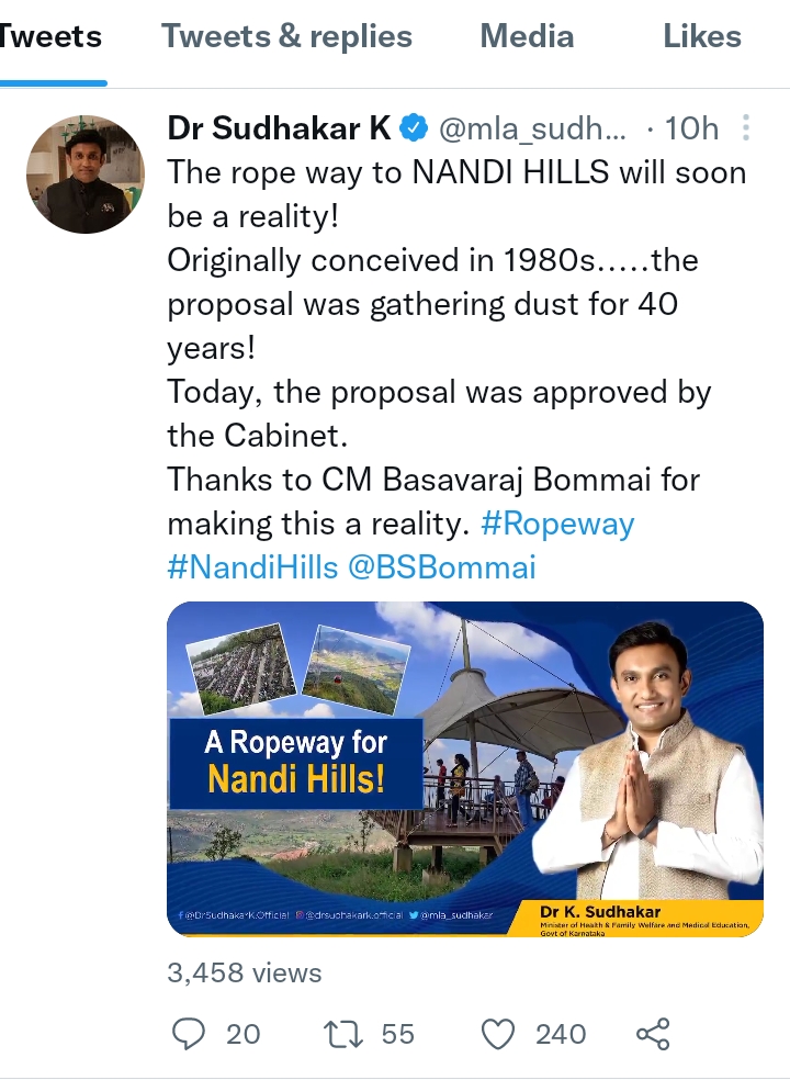 Expressing his happiness about cabinet nod for the long awaited ropeway project Health Minister and Chikkaballapur MLA Dr. K. Sudhakar said, “Nandi Hills located in Chikkaballpaur district, just around 60 kms away from Bengaluru city has emerged as a popular weekend get away for youngsters.