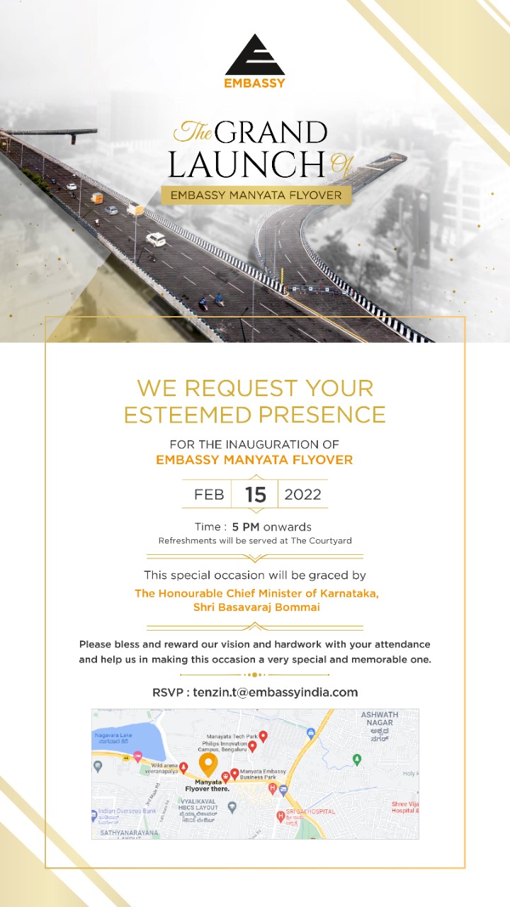 The much awaited Embassy Manyata flyover will be thrown open to public use, benefitting largely the Manyata Tech Park and residents towards it, on Tuesday evening by Chief Minister Basavaraj Bommai.