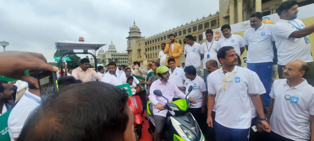 Minister himself rode electric vehicle from Vidhana Soudha to Chamara Vajara hall at Palace Ground along with BESCOM MD P. Rajendra Cholan and other officials.