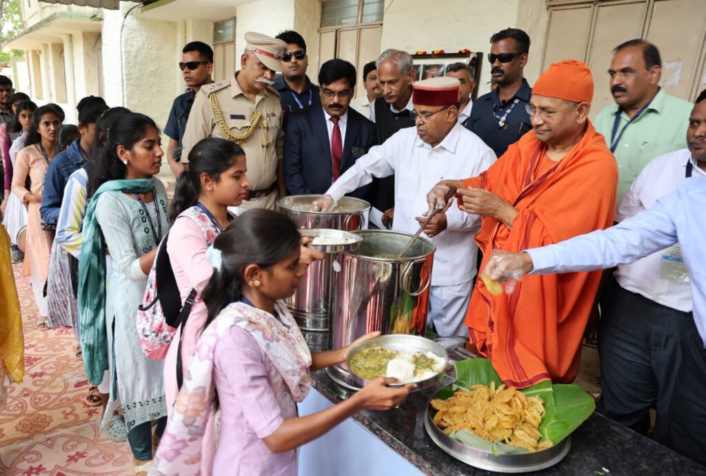 Tumakuru, July 9: Governor Thaawarchand Gehlot, visited the Annapoorneshwari Food Committee’s hot meal distribution center on the Tumkur University campus on Tuesday and personally served hot, nutritious meals to students, extending heartfelt appreciation for the initiative.