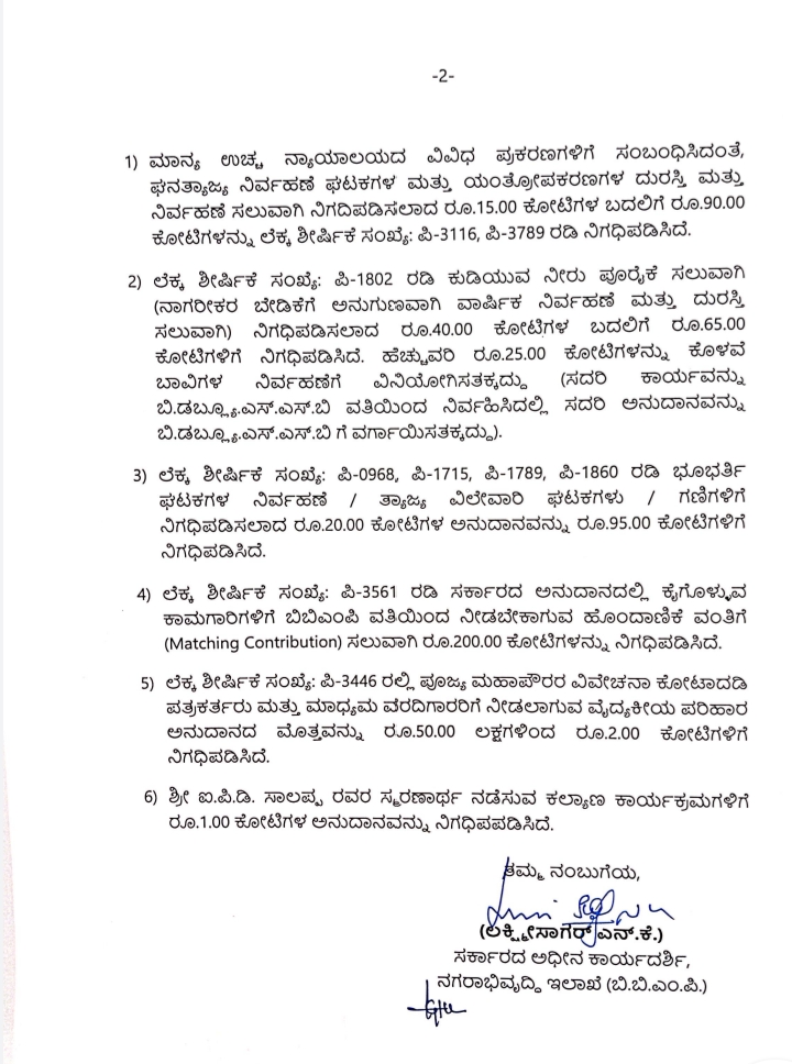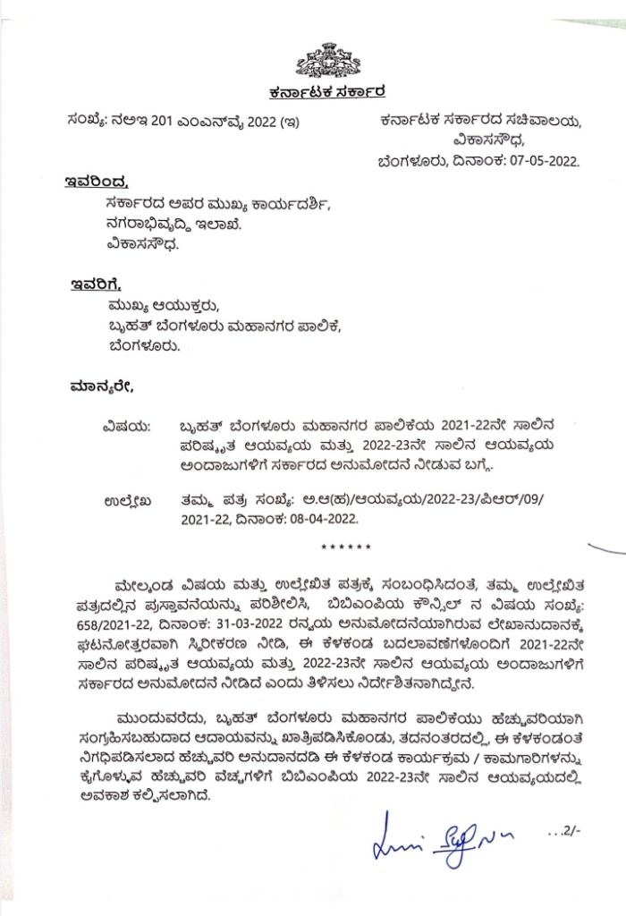 Bengaluru, May 7: The BBMP budget with an outlay of Rs. 10.484.90 crore has been approved by the government with minor re-appropriations. However, the total outlay of the budget remains unchanged.