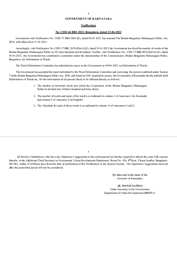 Bengaluru, June 23: After dillydallying, the state government has finally issued a draft notification on BBMP ward delimitation paving way for the BBMP polls after almost two years of end of the previous council.