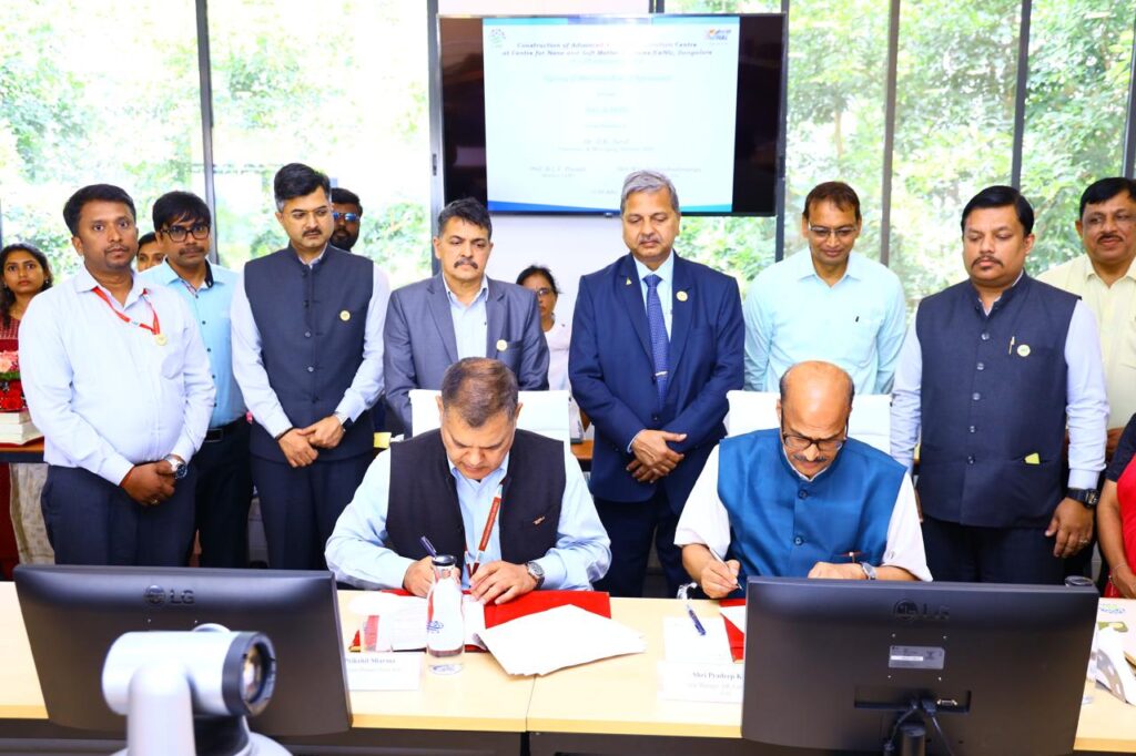 Bengaluru, July 12: In a significant step to popularise science and promote social outreach, Hindustan Aeronautics Limited (HAL) on Friday signed a Memorandum of Agreement (MoA) with the Centre for Nano and Soft Matter Sciences (CeNS) for the establishment of a HAL Advanced Academic Initiation Centre, under its Corporate Social Responsibility (CSR) initiatives. Mr. Pradeep Kumar, General Manager (HR), HAL signed the agreement with Prof. B. L. V Prasad, Director (CeNS) in the presence of Dr. D. K. Sunil, CMD, HAL, Mr. M. G. Balasubrahmanya, Director (HR), HAL, and other senior officials.