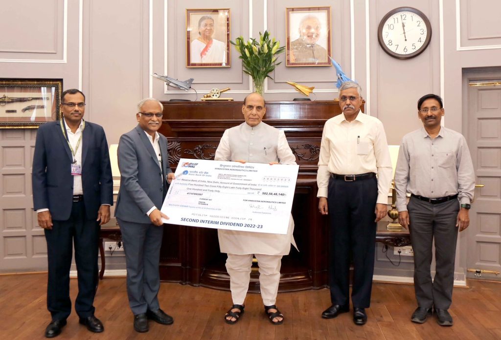 Bengaluru, April 10: HAL has paid the second interim dividend of Rs 502.58 crores to the Government of India for the F.Y. 2022-23. The dividend cheque was handed over to the Raksha Mantri, Mr. Rajnath Singh by Mr C. B. Ananthakrishnan, Director (Finance) & CFO with Addl. Charge of CMD-HAL and Mr E.P. Jayadeva, Director (Operations) in the presence of Mr Giridhar Aramane, Defence Secretary and Mr T. Natarajan, Additional Secretary (Defence Production) in New Delhi today.