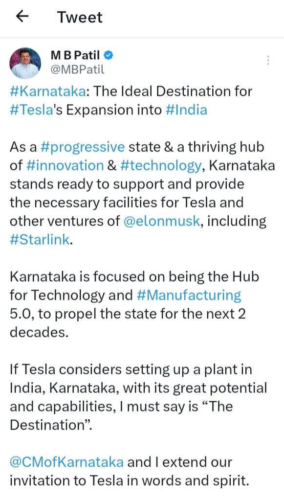 The government ready to support and provide the necessary facilities for Tesla and other ventures of entrepreneur Elon Musk, including Starlink, he has assured. Chief Minister Siddaramaiah has also evinced interest regarding this, Patil has added.