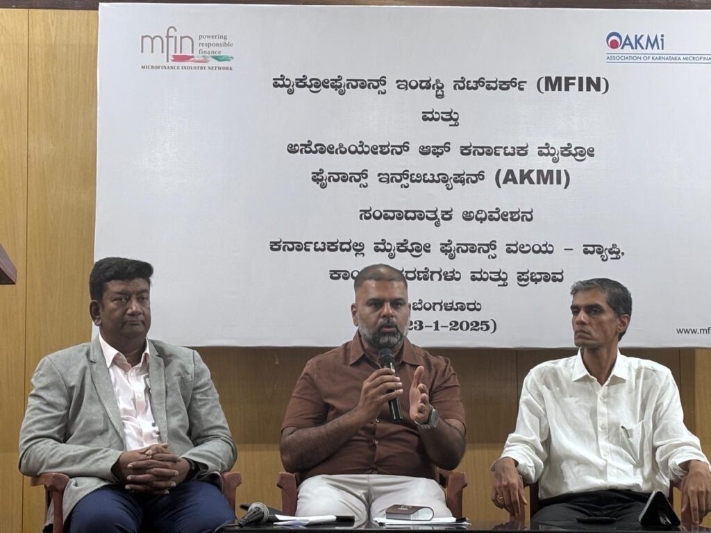 Bengaluru, Jan. 24: Microfinance Industry Network (MFIN), a Self-Regulatory Organisation (SRO) recognised by RBI and the Association of Karnataka Microfinance Institutions (AKMI), jointly organised a press meet in Bengaluru to highlight the critical role of microfinance institutions in improving the lives of the underprivileged sections of the society in the state. Mr. Rama Kamaraju, Head – State Initiatives at MFIN along with Mr. Venkatesh N, Managing Director, IIFL Samasta and Mr. Anand Rao, JMD, Chaitanya India Fin Credit underlined the immense contribution of microcredit loans in fostering financial inclusivity and empowerment in both rural and urban Karnataka.