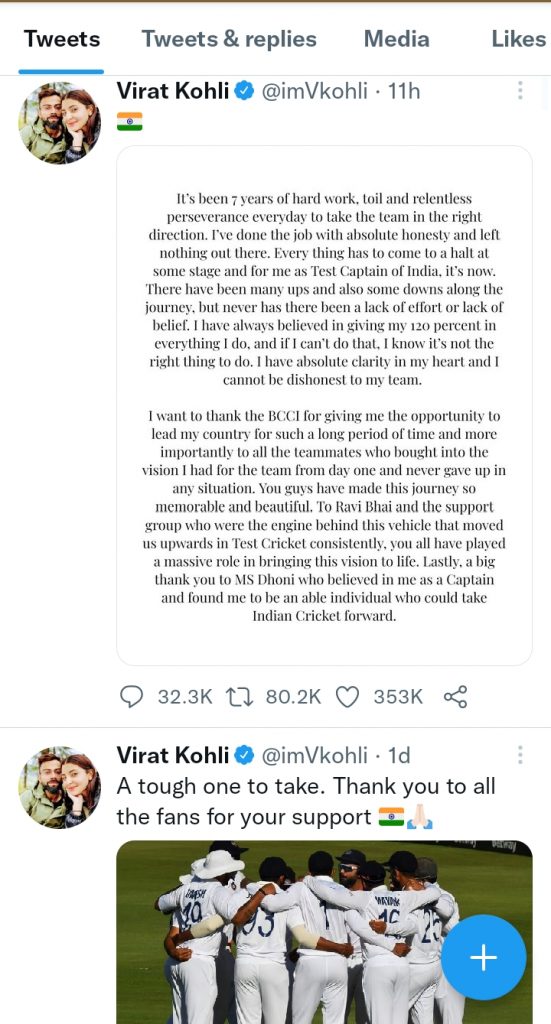 “It’s been seven years of hard work, toil and relentless perseverance everyday to take the team in the right direction. I’ve done the job with absolute honesty and left nothing out there. Every thing has to come to a halt at some stage and for me as Test Captain of India, it’s now. There have been many ups and also some downs along the journey, but never has there been a lack of effort or lack of belief. I have always believed in giving my 120 per cent in everything I do, and if I can’t do that, I know it’s not the right thing to do. I have absolute clarity in my heart and I cannot be dishonest to my team, ” he tweets.