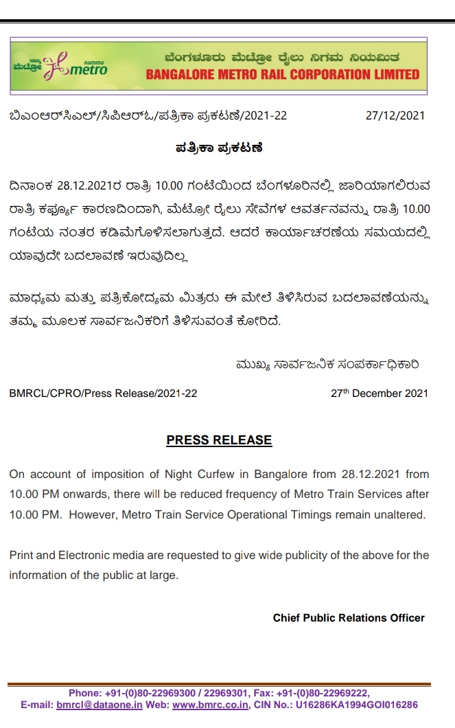 The curfew will be imposed in Bengaluru between 10 pm and 5 am. Hence, metro has reduced the frequency of the metro post 10 pm.