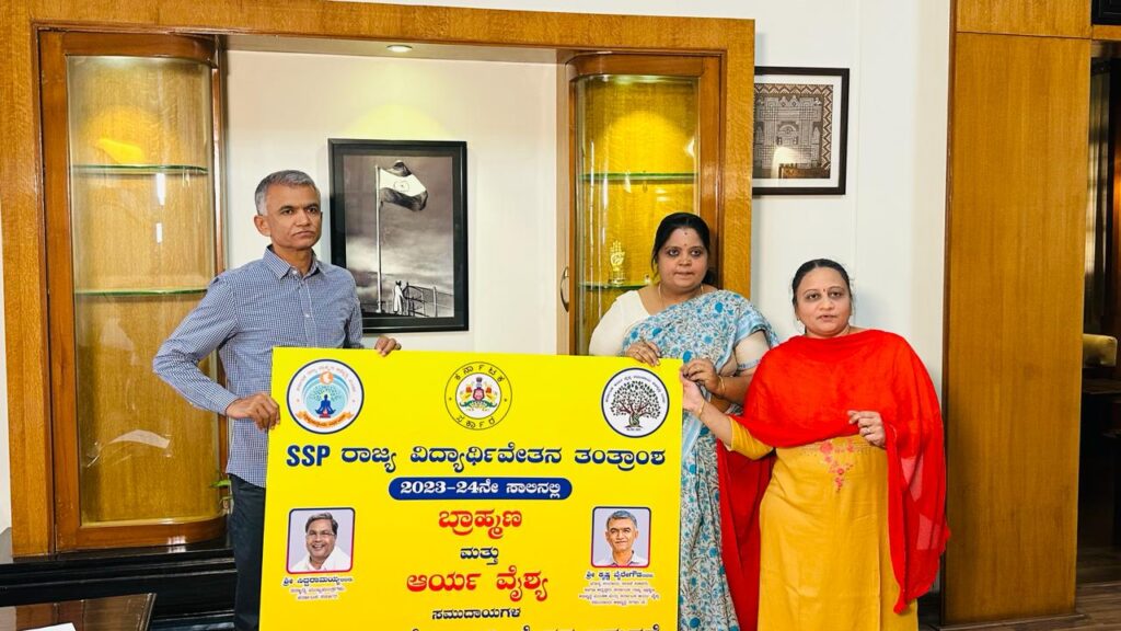 During the scholarship disbursement event, Mrs. Poornima PV, the Managing Director of Karnataka State Brahmin Development Board, and Mrs. Deepashree K, the Managing Director of Karnataka Arya Vysya Community Development Corporation, were present.
