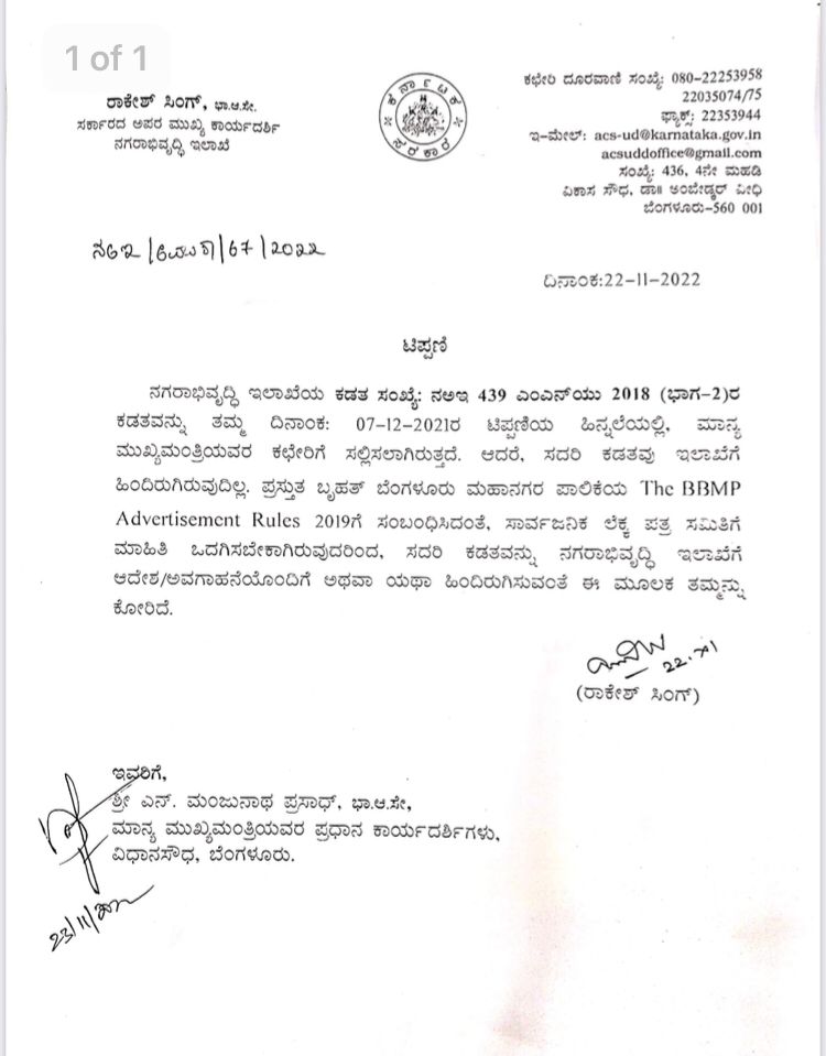 The file pertaining to BBMP advertisement was sent to chief minister’s office about a year ago for suggestion and approval. The file regarding the advertisement contains vital information about the display, size and advertisement fare.