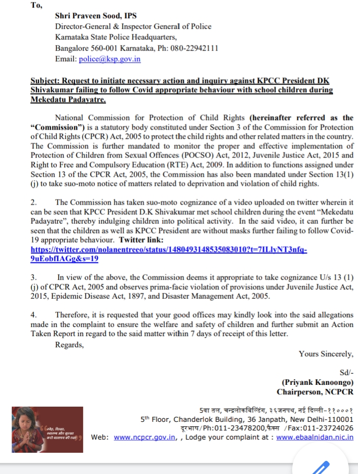 Chairperson of NCPCR Priyank Kanoongo has complined to DG&IGP Praveen Sood request him to initiate necessary action and inquiry against Mr Shivakumar for failing to follow Covid appropriate behaviour with school children during Mekedatu Padayatre.