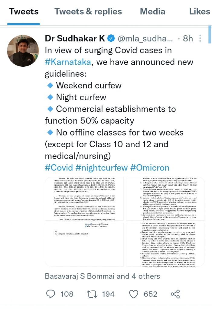 - In Bengaluru Urban district, all schools and colleges except, Medical and Para Medical will remain closed with effect from 06-01-2022 except class 10th and 12th.