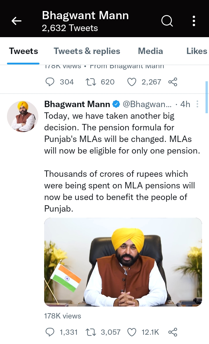 “Thousands of crores of rupees which were being spent on MLA pensions will now be used to benefit the people of Punjab,” Mann said via his Twitter handle.