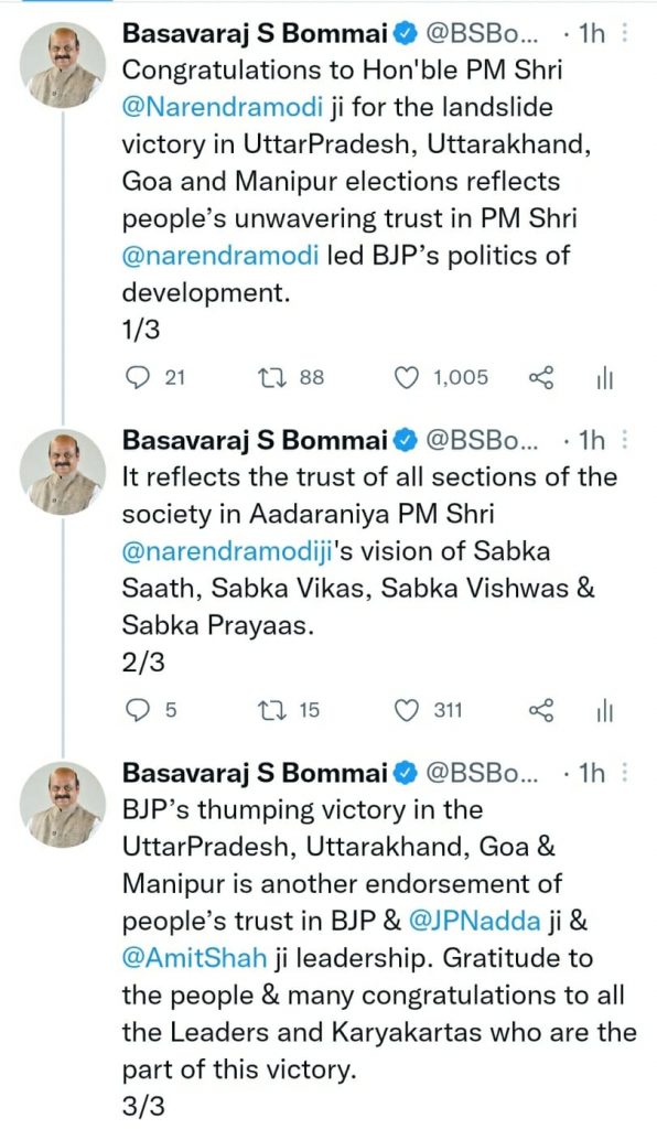 Thanking the voters of 5 states, Bommai said, the double engine governments of Modi and Yogi are taking Uttar Pradesh on the path of development. Bommai congratulated Prime Minister Modi, BJP National President JP Nadda and Union Home Minister Amit Shah for BJP’s good performance.