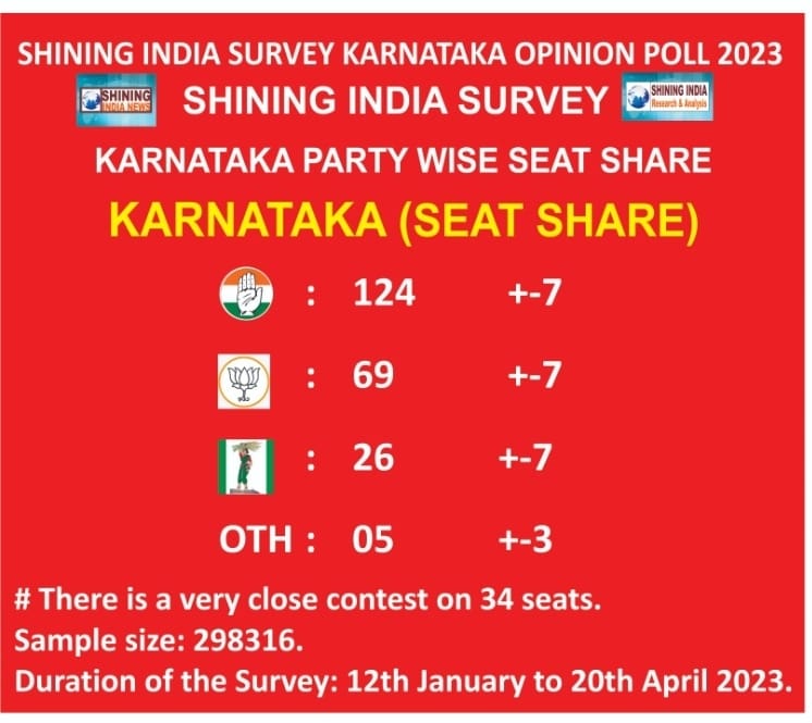 As per the Shining India Survey Karnataka Opinion Poll 2023 report, prepared by Rithvik Shining from Karnataka, released at the press club will garner following percentage of votes.