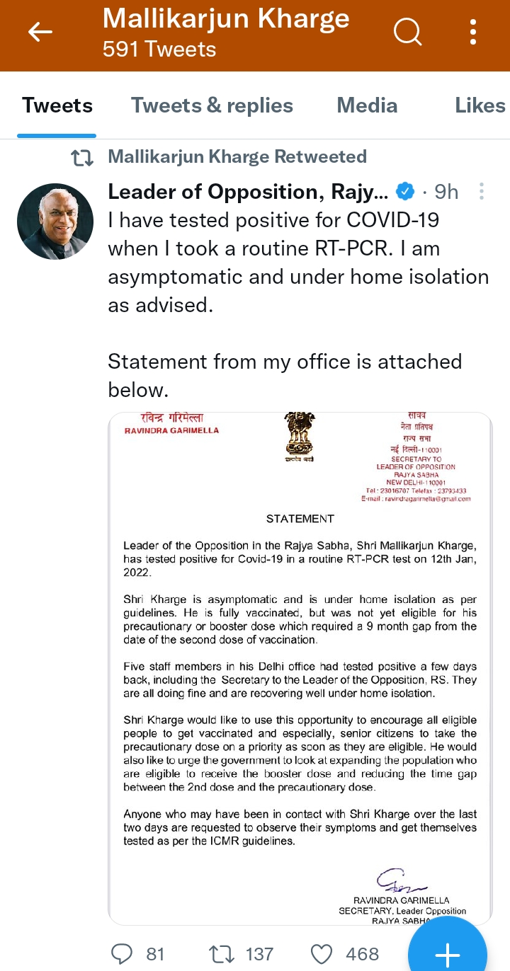 Rajyasabha Opposition leader Mallikarjun Kharge along with his five staff members, at his office, have tested positive for Corona on Thursday.