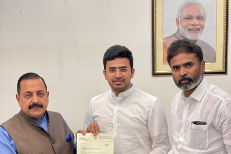 New Delhi, March 24: Bengaluru South MP Tejasvi Surya has requested that government recruitment exams be made available in regional languages, along with English and Hindi, in a meeting with Minister Dr Jitendra Singh.