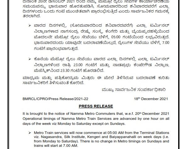 Here is a good news for Namma Metro commuters. The metro services will be operational...