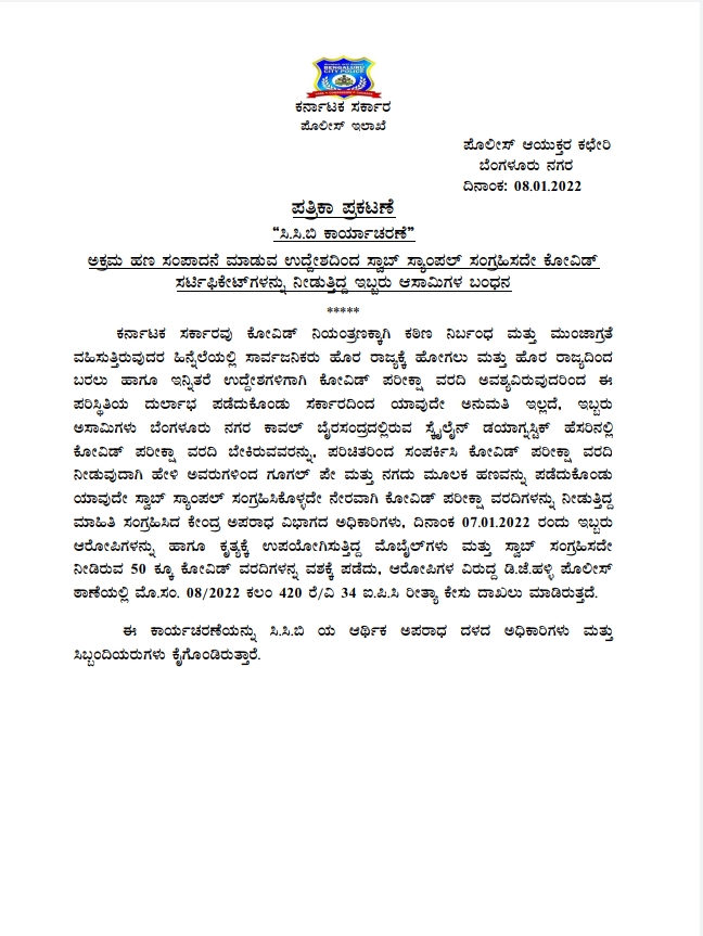 Bengaluru, Jan 8: In a shocking incident, police on Saturday arrested two persons for issuing fake RT-PCR negative certificates for those entering the state from other states. The police have seized 50 fake RT-PCR certificates and mobiles.