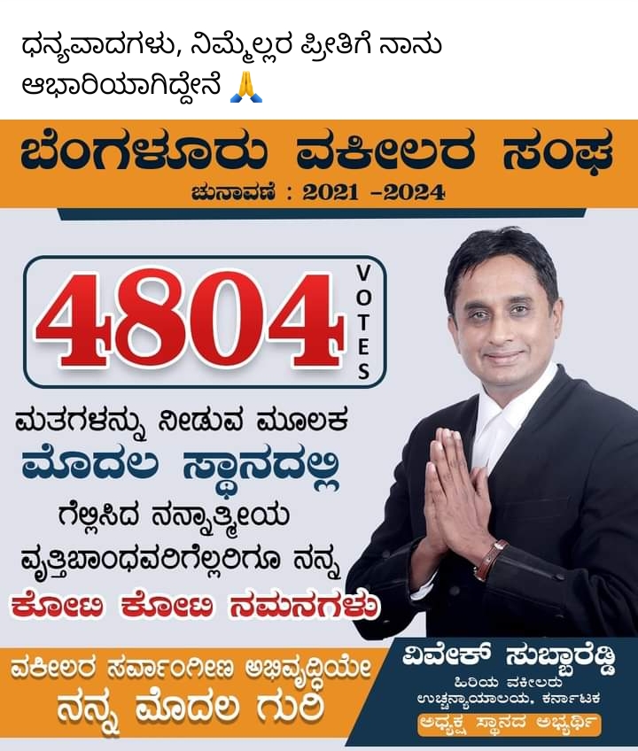 Noted advocate Vivek Subbareddy has emerged victorious and will be new president of advocates’ association (2021-2024) by securing 4808 votes.